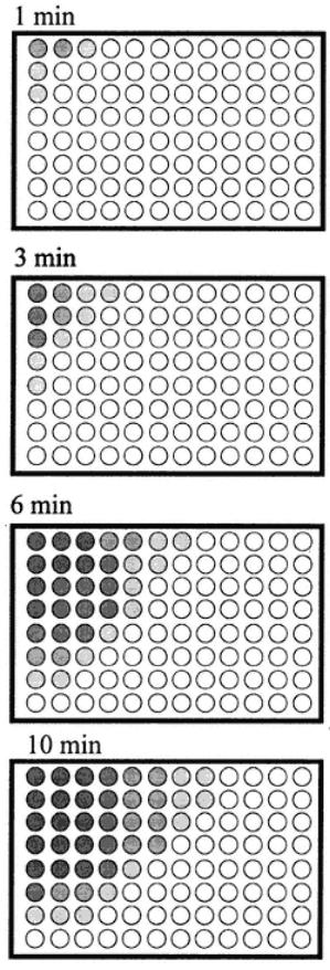 Little happens during the first 30 s to 1 min after the addition of substrate. Color then is detected in wells 1¨C3 of rows A and B and possibly C. The strongest color is detected in the wells containing the highest concentrations of