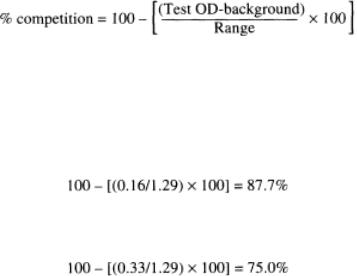 The mean of row G = 1.35, which is equivalent to 0% competition (a lot of color). The mean of row H = 0.07, which is equivalent to 100% competition (little color). Subtract the mean of row H from all the values obtained. If the value is minus then call it 0. This determines the 100¨C0% OD competition values (i.e., the range is from 0 to 1.29 OD).