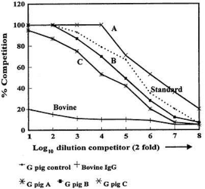 1.The bovine IgG competition is very low, and the slope of the curve is very different from those of homologous control guinea pig IgG.
