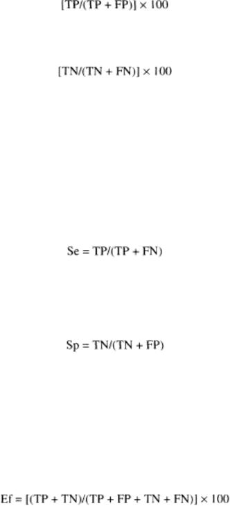 The overall efficiency (Ef) of a diagnostic test, defined as the percentage of subjects correctly classified as diseased or healthy, with a given prevalence of P, is estimated using the following relationship: