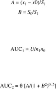 The theoretical exponential function underlying the ROC plot is estimated on the assumption that data from two groups are distributed normally (bimodally). The ROC function is then characterized by parameter A (standardized mean difference of the responses of two groups) and the parameter B (ratio of SDs). Thus, for a set of data for a positive and negative reference group with means of x0 and x1, in which x0 < x1 and the SDs are s0 and s1, respectively,
