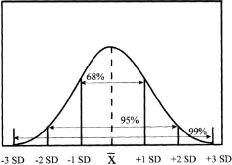 Mean , and plus or minus 1, 2, 3 ¡Á SD encompases the percentages indicated. Thus, e.g., 95% of all results in a population would be distributed about the mean between +2 and ¨C2 ¡Á SD.