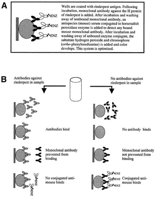 Principles of competitive ELISA for measuring antibodies against rinderpest virus: (A) pretitration of indirect ELISA; (B) blocking of ELISA to detect antirinderpest antibodies in serum samples.