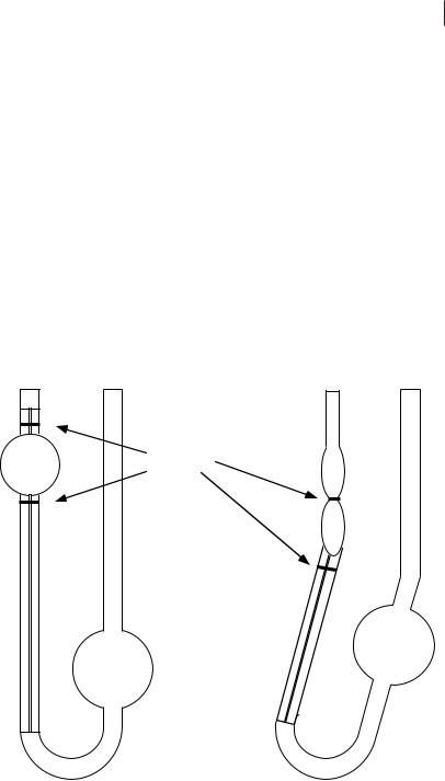 Figure 3.2-1: Diagrams of (A) Ostwald and (B) Cannon–Fenske capillary viscometers.