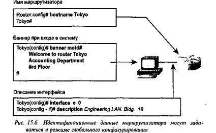 Одной из первых базовых задач является присвоение маршрутизатору имени. Имя маршрутизатора будет считаться именем хост-машины и являться тем именем, которое выводится в системной командной строке. Если имя не сконфигурировано, то в системе имя маршрутизатора по умолчанию — Router. Можно присваивать имя в режиме глобального конфигурирования. В примере, показанном на рис. 15.6, маршрутизатору присваивается имя