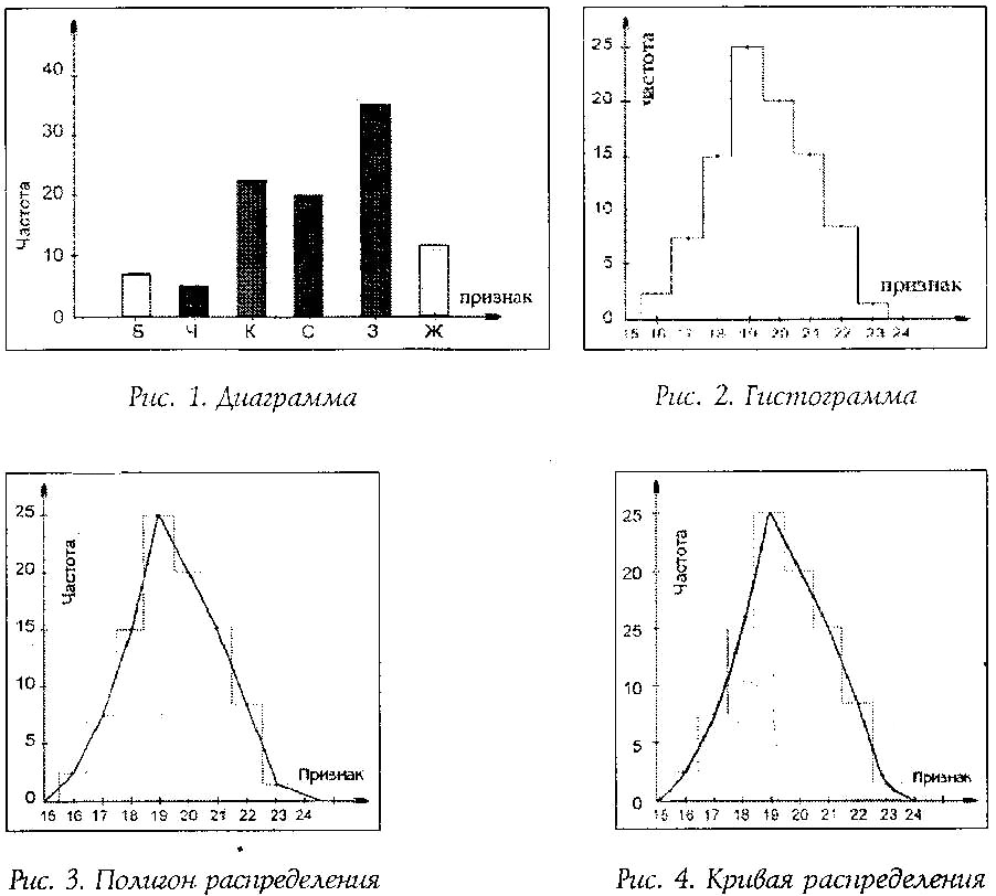 К основным методам первичной обработки относятся: табулирование, т. е. представление количественной информации в табличной форме, и построение диаграмм (рис. I), гистограмм (рис. 2), полигонов распределения (рис. 3) и кривых распределения (рис. 4). Диаграммы отражают распределение дискретных данных, остальные графические формы используются для представления распределения непрерывных данных.