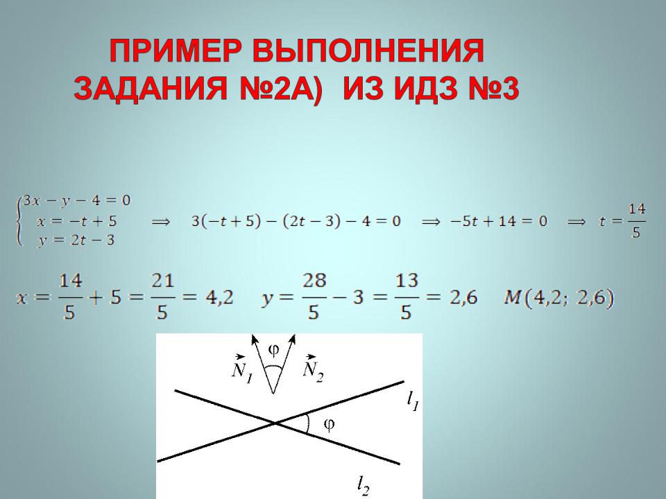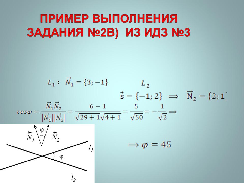 2b). Косинус угла между прямыми найдем как косинус угла между их нормальными векторами: