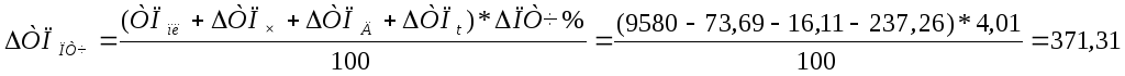 Чтобы рассчитать влияние второго фактора, нужно к плановой величине результативного показателя прибавить изменение его за счет первого фактора и затем полученную сумму умножить на относительный прирост второго фактора в процентах и результат разделить на 100.