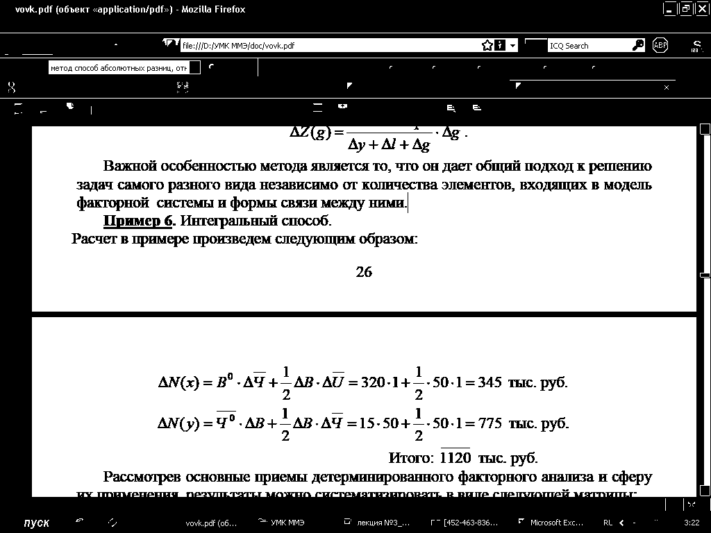 Его суть состоит в том, что находится абсолютное отклонение по каждому фактору, затем определяется влияние этого отклонения на изменение обобщающего показателя. Как и способ цепной подстановки, он применяется для расчета влияния факторов на прирост результативного показателя в детерминированном анализе, но только в мультипликативных и смешанных моделях типа. И хотя его использование ограничено, он благодаря своей простоте получил широкое применение в АХД.