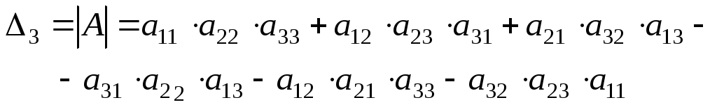 Это число представляет алгебраическую сумму, состоящую из 6 слагаемых. В каждое слагаемое входит по одному элементу из каждой строки и каждого столбца матрицы. Знаки, с которыми члены определителя входят в (2.1), легко запомнить, пользуясь схемой (Рис.1), которая называется правилом треугольников или правилом Сарруса