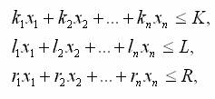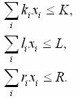 В рассматриваемой задаче заданы экзогенные переменные – имеющиеся количества оборудования К, рабочей силы L и сырья R; заданы параметры – коэффициенты их расхода на единицу i-ой продукции ki, li и ri соответственно. Цены продуктов pi также известны.