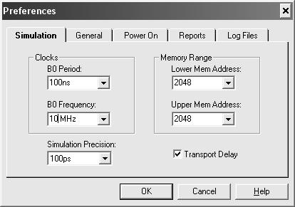 Встроенные генераторы периодических сигналов в этом окне изображены в виде светодиодов в двух строчках Bc: и NBc: (прямое и инверсное значения сигналов). Каждая строка светодиодов представляет собой выходы 16-разрядного двоичного счетчика. Выходы счетчика могут быть поданы на любое число внешних входов. Частота переключения младшего разряда счетчика определяется как базовая частота синхросигналов и устанавливается в окне Preferences. На остальных выходах счетчика будет появляться пересчитанная базовая частота.