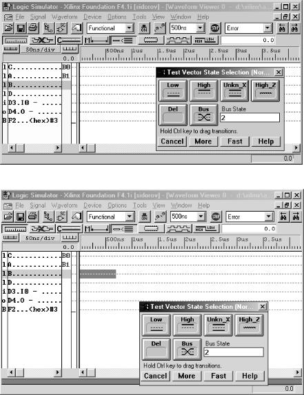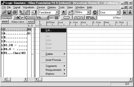 1. Щелкните правую клавишу мыши в поле временных диаграмм окна моделирования схемы. Появится меню, в котором щелкните опцию Edit (рис. 74). Откроется окно Test Vector State Selection (рис. 75).