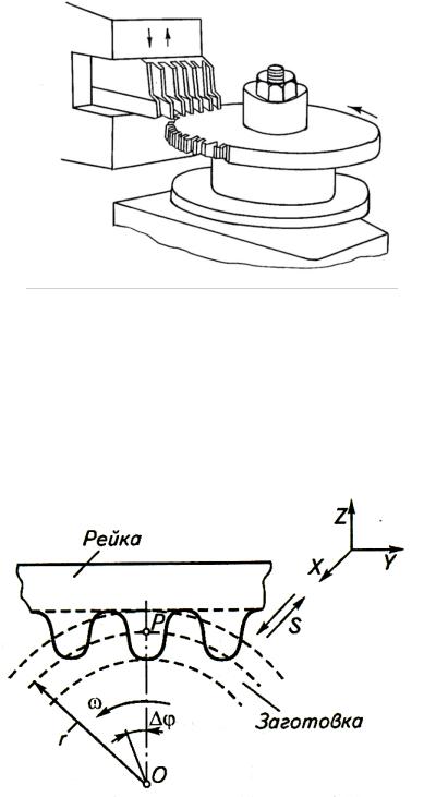Рисунок 9 – Нарезание зубьев методом обкатки (огибания) зубчатой гребенкой (рейкой)