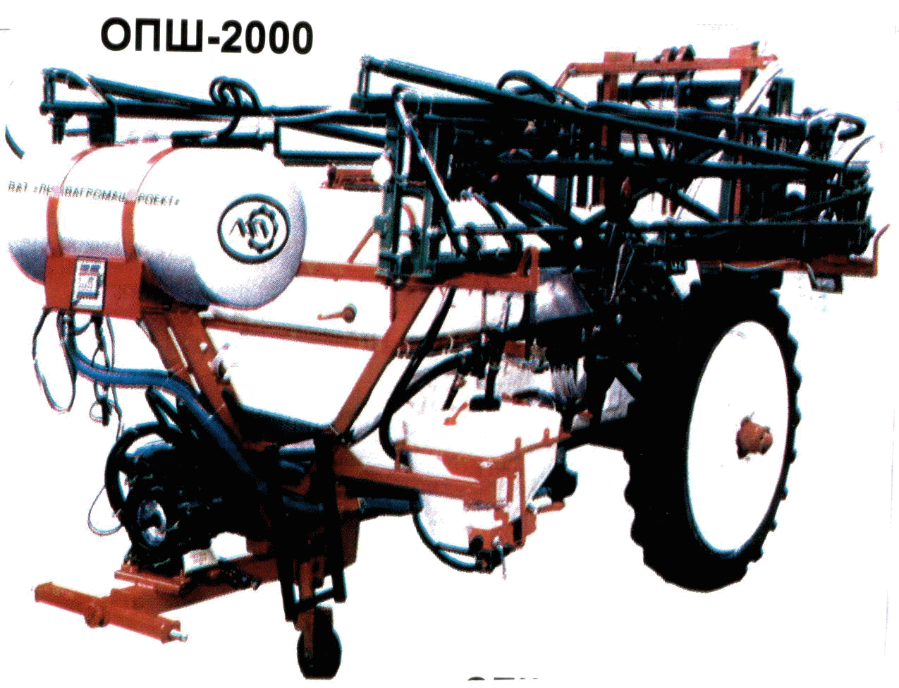 Оприскувач причіпний широкозахватний ОПШ-2000 призначений для суцільного обприскування пестицидами, а також для підживлення посівів рідкими добривами. Може додатково комплектуватись пінних маркером, міксером для приготування робочих розчинів, бортовим комп’ютером для автоматичного управління техноголічним процесом, системою промивання комунікацій, багатопозиційними розпилюючими голівками та ін. Ширина захвату 18,0-21,5 м, місткість баку 2000 л, витрачання пестицидів 75-300 л/га, а мінеральних добрив 200-400 кг/га, робоча швидкість 8-12 км/год, висота підняття штанги 0,5-1,9 м, агрегатується з тракторами класу 14 кН (рис. 90 ).
