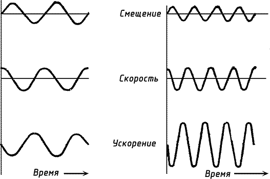 Поэтому говорят, что на очень низких частотах передача звука через панель управляется ее упругостью, но по мере роста частоты инерция (масса) становится значительно более существенной. Поясним это на примере, когда возбуждающая сила — синусоидальный звук (чистый тон). В этом простейшем случае смещение панели синусоидально. Мы уже знакомы с графиком синусоидальной функции. Скорость изменения положения — это скорость, скорость же изменения скорости — ускорение. На рис. 39 показаны графики смещения, скорости и ускорения для панели, колеблющейся на некоторой определенной частоте, а также на частоте вдвое большей. При данном звуковом давлении с увеличением частоты смещение убывает по амплитуде, но скорость частиц остается без изменения. Далее, на рисунке видно, что при этом скорость изменения скорости стала вдвое больше: максимальное значение ускорения удваивается при удвоении частоты. Но, согласно второму закону Ньютона, ускорение прямо пропорционально приложенной силе. Таким образом, теоретически при удвоении частоты потребовалась бы вдвое большая сила, чтобы заставить панель колебаться с той же скоростью. Однако, так как действующая со стороны звуковой волны сила не изменилась, удвоение частоты звука приведет к уменьшению амплитуды колебаний панели вдвое.