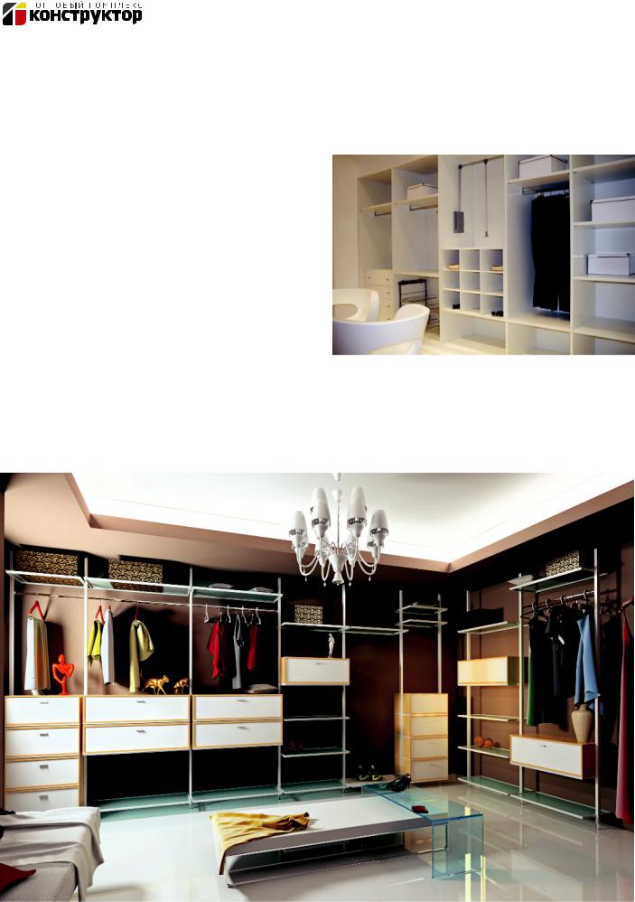 В случае, если у вас маленькая гардеробная, ста- райтесь подобрать каркас светлого цвета и свет- лый оттенок использовать для стен — это все опять же для увеличения пространства.