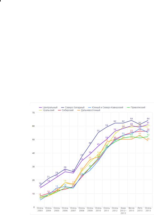 We see, that Russia is among the top ten active users of social networks, competing with the United States and China. People willingly create the page, but only part of them uses it constantly.