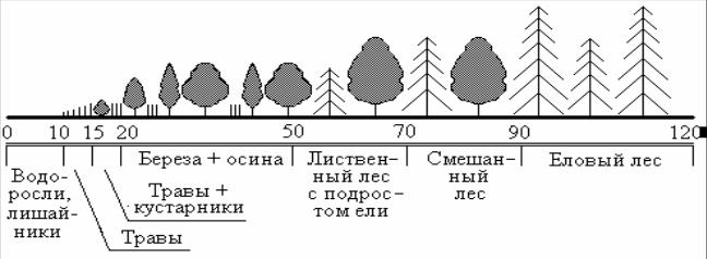 Продолжительность сукцессии от зарождения экосистемы до стадии климакса может составлять до сотен и даже до тысяч лет. Столь длительная продолжительность связана в основном с необходимостью накопления питательного вещества в субстрате. Изначально на безжизненном субстрате поселяются так называемые пионерные виды, типа лишайников и корковых водорослей (рисунок 1). За 5-10 лет они несколько обогащают субстрат питательными веществами, формируя зачатки почвы. Затем на этих еще совсем бедных почвах поселяются травы, еще более обогащая почву. Лет через 15 от начала сукцессии на когда-то безжизненном пространстве поселяются первые кустарники, которые постепенно вытесняются лиственными светолюбивыми деревьями, чаще всего березой и осиной, которые характеризуются быстрым ростом. К 50-летнему возрасту в молодом лиственном лесу выделяются наиболее сильные деревья, которые затеняют более слабую поросль, которая погибает, давая возможность поселиться под пологом лиственного леса поросли ели. Ель более теневынослива, под защитой лиственных деревьев она постепенно догоняет их в росте, отвоевывая у них жизненное пространство, ель становится доминирующим видом-эдификатором, формируя особым образом всю жизнь населяющего данную экосистему сообщества.