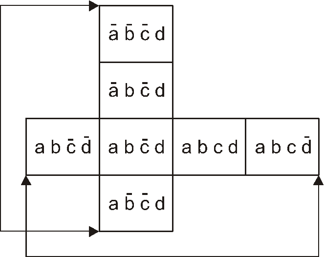 Очевидно, что наборы переменных (соответствующие конституентам переключательной функции) двух соседних клеток отличаются друг от друга значением только одной переменной. Такие наборы, отличающиеся значением одной переменной, называются соседними наборами (кодами). Таким образом, соседние клетки карты Карно имеют соседние коды (наборы). Можно также сказать, что между соседними кодами имеется кодовое расстояние, равное единице (кодовое расстояние равно количеству разрядов, в которых коды отличаются друг от друга). Соседними являются также крайние левые клетки карты Карно с крайними правыми клетками и крайние верхние клетки с крайними нижними (как если бы карта была свернута по вертикали и по горизонтали). В этом легко убедиться, сравнивая наборы (рис. 45).