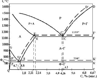 Рисунок 5.1 – Стабільна діаграма стану залізо-графіт (штрихові лінії)