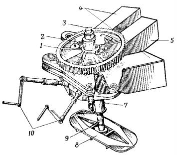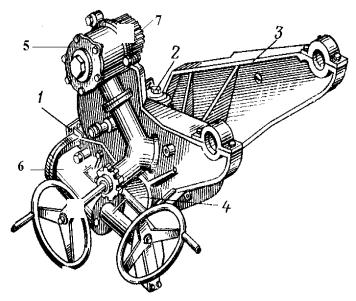 Подъемный механизм 5 предназначен (рис. 2.7.1) для придания стволу гаубицы вертикальных углов наведения от –7 до + 70°. Подъемный механизм секторного типа. Он состоит из картера 5, вала с шестерней, червячного колеса 7, привода 3. Вал с шестерней установлен в картере на двух конических роликовых подшипниках. Поджатие подшипников осуществляется крышкой 8. Вал с шестерней входит в зацепление с сектором люльки. На шлицах вала установлено и закреплено гайкой червячное колесо. Червячное колесо состоит из ступицы и латунного обода, соединенных цилиндрическими штифтами. Привод подъемного механизма состоит из пары конических шестерен, установленных на шариковых подшипниках 9 в коробке привода; на вал с шестерней через втулку 2 установлен маховик с рукояткой 1, привод крепится к картеру 5 подъемного механизма болтами с гайками.