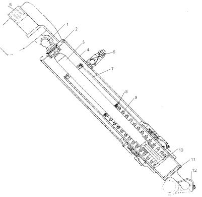 Станины. Гаубица имеет три станины (рис. 2.11.2): неподвижную 4 и две подвижные 3. Левая и правая станины соединены с нижним станком 1 шарнирно, а неподвижная станина приварена к нижнему станку. В боевом положении станины разводятся под углом 120° относительно неподвижной станины и в этом положении фиксируются стопорами. В походном положении подвижные станины сводятся к неподвижной и крепятся к ней стяжным устройством 5; неподвижная станина соединяется специальной рамкой 8 со стволом у его дульной части. Каждая станина состоит из короба, усиленного изнутри и снаружи угольниками; к хоботовой части станин приварено плато 7, которым станины опираются на грунт, а к передней части подвижных станин приварены шарнирные части 2, с помощью которых они закреплены с нижним станком. Шарнирные части имеют приливы с отверстиями, в которые входят стопора при разведении станин по-боевому. Смазка шарниров производится через масленки и каналы в пальцах шарниров. В плато и в накладках имеются отверстия с тремя пазами, через которые забиваются в грунт сошники; в забитом положении сошники стопорятся стопорами. В хоботовой части неподвижной станины приварены два кронштейна на которой крепится рамка для крепления ствола 8 в походном положении. На станинах крепятся сошники в походном положении при помощи держателей и буферов. К станинам приварены приспособления (упоры и держатели) для крепления шанцевого инструмента и принадлежностей (две штанги банника, веха, лом, кувалда, прибойник, две лопаты). Кроме того к правой станине приварена стойка для установки воздушно-гидравлического насоса и планка с указателем центра тяжести гаубицы в походном положении.