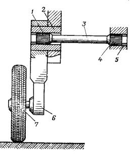 Механизм подъема колес (рис. 2.13.1) служит для подъема колес в боевое положение и для возвращения их в походное положение. Для подъема колес используется энергия уравновешивающего механизма. Механизм подъема колес состоит из опорного рычага 1, тяги 2, муфты 3, вилки 4, рукоятки 5 и стопора 6. В гнездо рычага впрессована латунная сфера. Снизу опорного рычага имеется упор, ограничивающий поворот опорного рычага под действием уравновешивающего механизма в случае среза оси. Опорный рычаг вставляется цапфами в кронштейн верхнего станка и крепится крышками. Тягой соединены опорный рычаг и ось хода. Муфта предназначена для жесткого соединения оси хода с верхним станком в походном положении гаубицы и для закрепления оси хода с поднятыми колесами в боевом положении гаубицы. Муфта внутренними зубьями находится постоянно в зацеплении с зубчатой полумуфтой верхнего станка; в рабочем положении муфта входит в зацепление с зубчатым венцом оси хода и закрепляется стопором. На наружной поверхности муфты имеется кольцевой паз, в