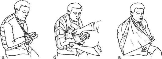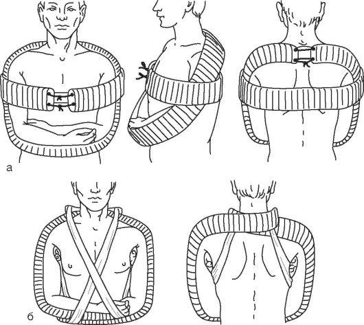 Рис. 62. Транспортная иммобилизация лестничными шинами при множественных повреждениях обеих верхних конечностей: а - П-образной шиной; б - сдвоенными шинами