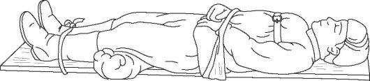 В тех случаях, когда отсутствуют какие-либо средства для осуществления транспортной иммобилизации, следует применить метод фиксации «нога к ноге». Поврежденную конечность в 2-3 местах связывают со здоровой или укладывают поврежденную конечность на здоровую, также связывая в нескольких местах (рис. 59).