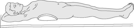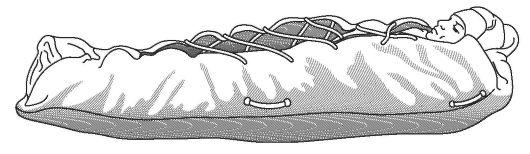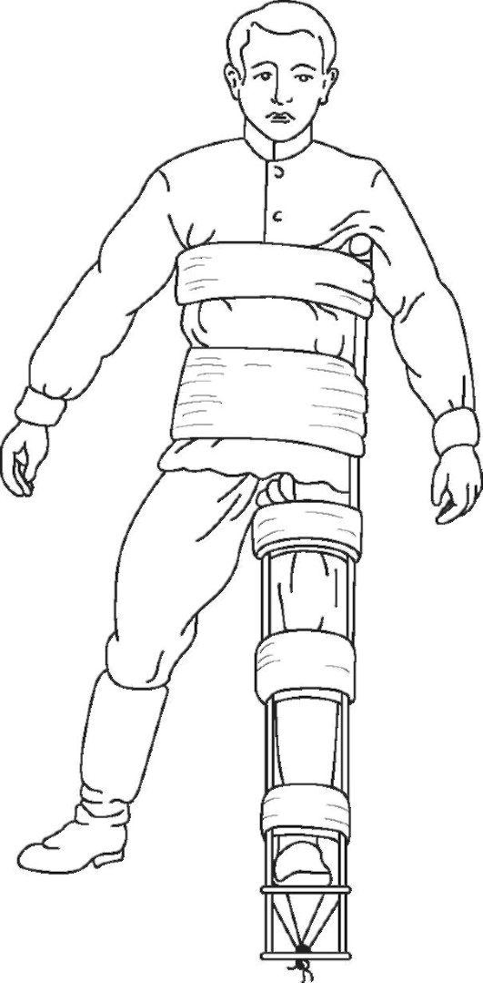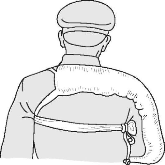 суставах под прямым углом и укладывают предплечья параллельно друг другу на животе. Подготовленную лестничную шину длиной 120 см выгибают в виде буквы П таким образом, чтобы средняя ее часть соответствовала сложенным друг на друга предплечьям. П-образную рамку размещают на обеих верхних конечностях, концы рамки выгибают по контурам спины и связывают между собой шнуром. Бинтом фиксируют сложенные вместе предплечья к средней части рамки, затем отдельными бинтами укрепляют оба плеча к боковым частям. Второй П-образной шиной охватывают со стороны спины грудь и конечности на уровне средней трети плеча (рис. 62).