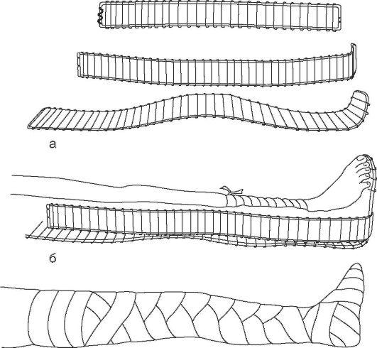 Рис. 60. Иммобилизация тремя лестничными шинами повреждений голени, голеностопного сустава, стопы: а - подготовка лестничных шин; б - наложение и фиксация шин