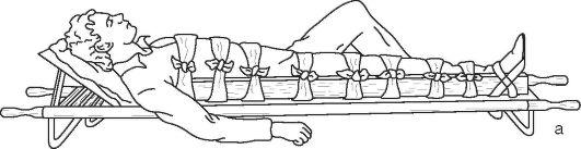 Рис. 58. Транспортная иммобилизация подручными средствами при повреждениях бедра, тазобедренного и коленного суставов: а - из узких досок; б - при помощи лыж и лыжных палок