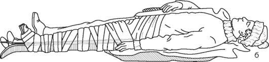 Рис. 59. Транспортная иммобилизация при повреждении нижних конечностей методом «нога к ноге»: а - простая иммобилизация; б - иммобилизация с легким вытяжением