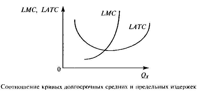 Кривые долгосрочных средних и предельных издержек соотносятся друг с другом так же, как и кривые краткосрочных издержек: если LMC лежит ниже LATC, то LATC падают, а если LMC лежит выше LATC, то LATC возрастают. Возрастающая часть кривой LMC пересекает кривую LATC в точке минимума.