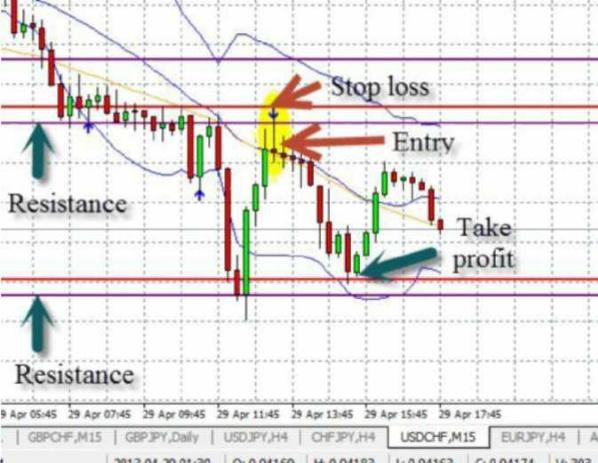 Это - USD CHF 15-минутный график. Как Вы можете видеть, рынок развернулся назад от фиолетовой линии основания, затем достиг фиолетовой линии вершины (сопротивление), и образовал хвост. Я ждал когда рынок восстановиться приблизительно на одну треть назад к "хвосту" свечи, а