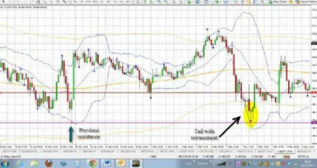 затем вошел в продажу, как только он возвратился вниз. Представьте "хвост" свечи как дорогу. Я хотел, чтобы рынок развернулся, поддерживая дорогу приблизительно на одну треть, а затем направился снова в нижнем направлении. Я всегда торгую так с "хвостами". Я жду приблизительного (это не должно быть точно), 33%-го восстановления. Это не основано на Fibonacci, это только мои наблюдения при изучении сотни графиков и сотни "хвостов" в специфических S&R линиях. Я не торгую хвост. Хвост должен удовлетворять условиям, изложенным в моей стратегии, и как только это происходит, тогда я жду восстановления и вхожу в сделку, как только он восстановится и "направится" назад. Ниже пример хвоста, где условия соответствуют сделке покупки.