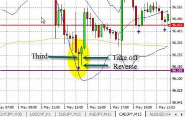 Это - NZD JPY 15-минутный график. Хвост образовался, когда мой синие ленты Bollinger были снаружи оранжевых лент Bollinger, и рынок был приближен к достоверной точке сопротивления, как показано на первом плане. Давайте посмотрим увеличенный участок графика с восстановлением.
