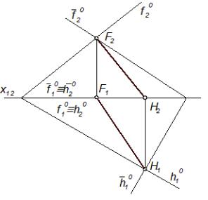 º2) – у точці F(F1, F2). Пряма HF(H1F1, H2F2) є лінією перетину площин Г і Δ, а точки H і F – це її сліди.