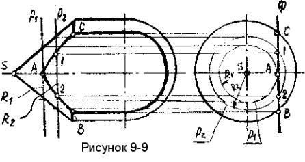 Деталь являє собою деякий тіло обертання, обмежене поверхнею конуса, циліндра і кулі. Точки лінії зрізу на поверхні конуса будуються за допомогою паралелей р. Побудова починаємо з знаходження крайньої лівої точки, для чого проводимо на вигляді зліва паралель р 1, дотичну до площини зрізу (радіуса R1) і знаходимо її положення на вигляді спереду. Для побудови інших точок проводимо низку паралелей, починаючи їх побудова з виду попереду. Потім будуємо їх на вигляді зліва і знаходимо точки перетину з фронтальною площиною - це і будуть точки лінії зрізу.