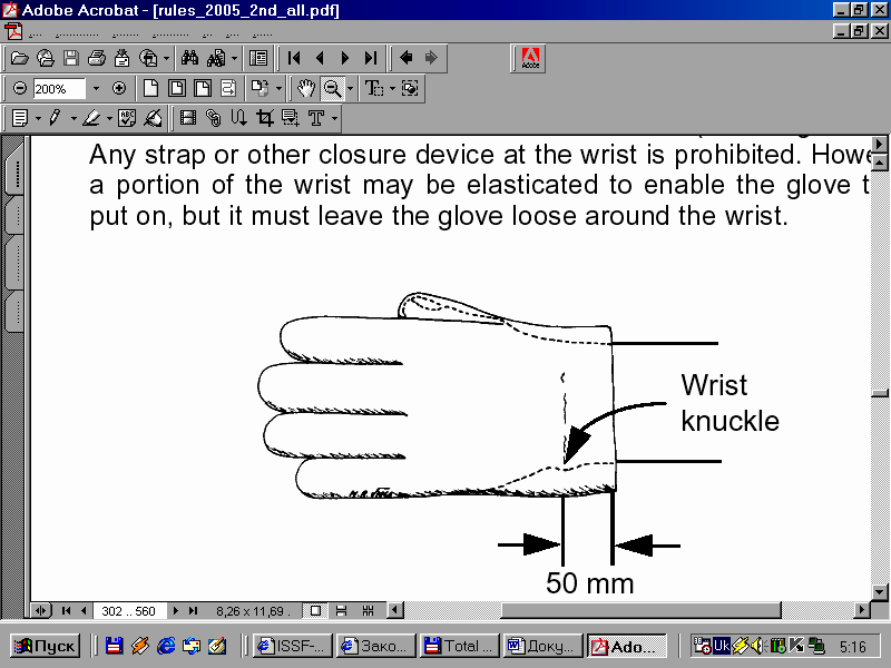 - дозволяється використовувати парні (однакові) рукавиці форменого типу (п’ятипалі, однотонного чорного, коричневого або темно-сірого кольору з однаково закритими пальцями, без зовнішніх накладок) з еластичного матеріалу, загальна товщина кожної з яких при вимірюванні лицевої і тильної частини разом поза межами швів та складок не перевищує 12 мм (при стисканні із зусиллям 5 кг). Рукавиця не повинна заходити на руку далі як на 50 мм за центр променевозап’ястного суглоба (мал.). Біля зап’ястя рукавиця повинна бути вільною для зручності при вдяганні, будь-які зав’язки заборонені;