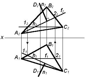3. Строим перпендикуляр n к плоскости Р( АВС). Для этого через точку D2 проводим n2, перпендикулярно f2, а через D1 проводим n1, перпендикулярно h1. n (n1n2) Р (АВС), так как n1h1;