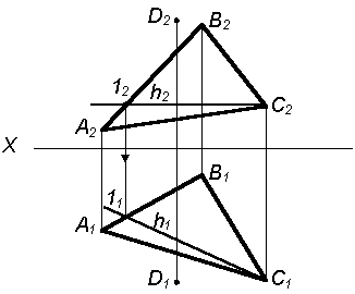 1. Для того чтобы построить перпендикуляр к плоскости Р( АВС) через точку D, необходимо сначала построить любую горизонталь в данной плоскости Р( АВС) – h (h1h2) |