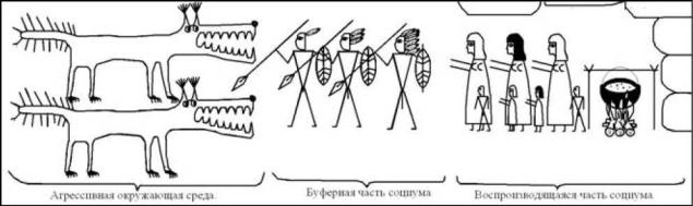 Итак, перед нами первобытное племя. Мужчины ходили на охоту, снабжали женщин и детей мясом и защищали их от хищников и врагов. Женщины и старики оставались работать в пещере или стойбище или занимались собирательством неподалеку. Возле них росли дети, впитывая информацию о жизни из пересудов болтливых женщин и воспоминаний словоохотливых стариков. То есть биологическая единица имела четкую внутреннюю функциональную, а следовательно, и организационную структуру. Разберем функции и тактикотехнические характеристики каждого элемента этой структуры.