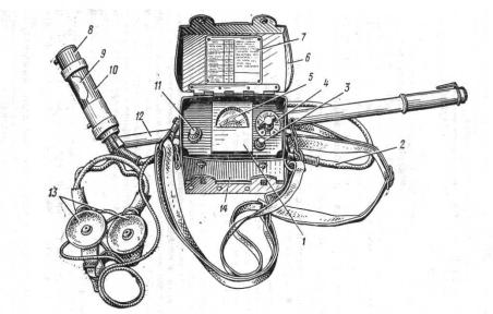 1 – измерительный пульт; 2 – соединительный кабель; 3 – кнопка сброса показаний; 4 – переключатель поддиапазонов; 5 – микроамперметр; 6 – крышка футляра прибора; 7 – таблица допустимых значений заражения объектов; 8 – блок детектирования; 9 – контрольный источник; 10 – поворотный экран; 11 – тумблер подсвета шкалы микроамперметра; 12 – удлинительная штанга; 13 – головные телефоны; 14 — футляр.