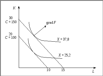 На рис. 2.2 10 зображені ізокости (лінії постійних витрат для С = 100, 150) та ізокванти (лінії постійних випусків для Х = 25,2; 37,8).