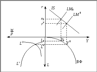 У першому квадранті тут зображено лінії IS,LM, у четвертому — виробничу функцію економіки (ВФ) як функцію L, у третьому — криві попиту і пропозиції на робочу силу. Як бачимо, причинні зв’язки направлені від ринків товарів і грошей до ринку робочої сили через ВФ, а отже, ринок праці не є визначальним.