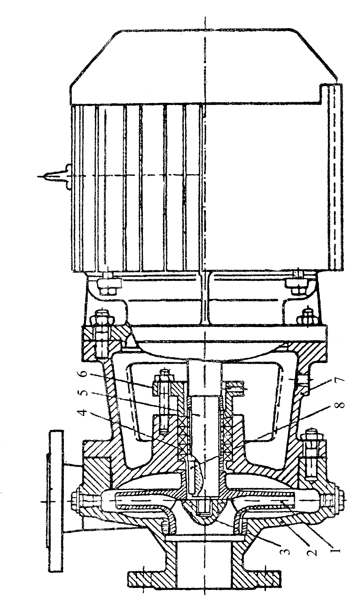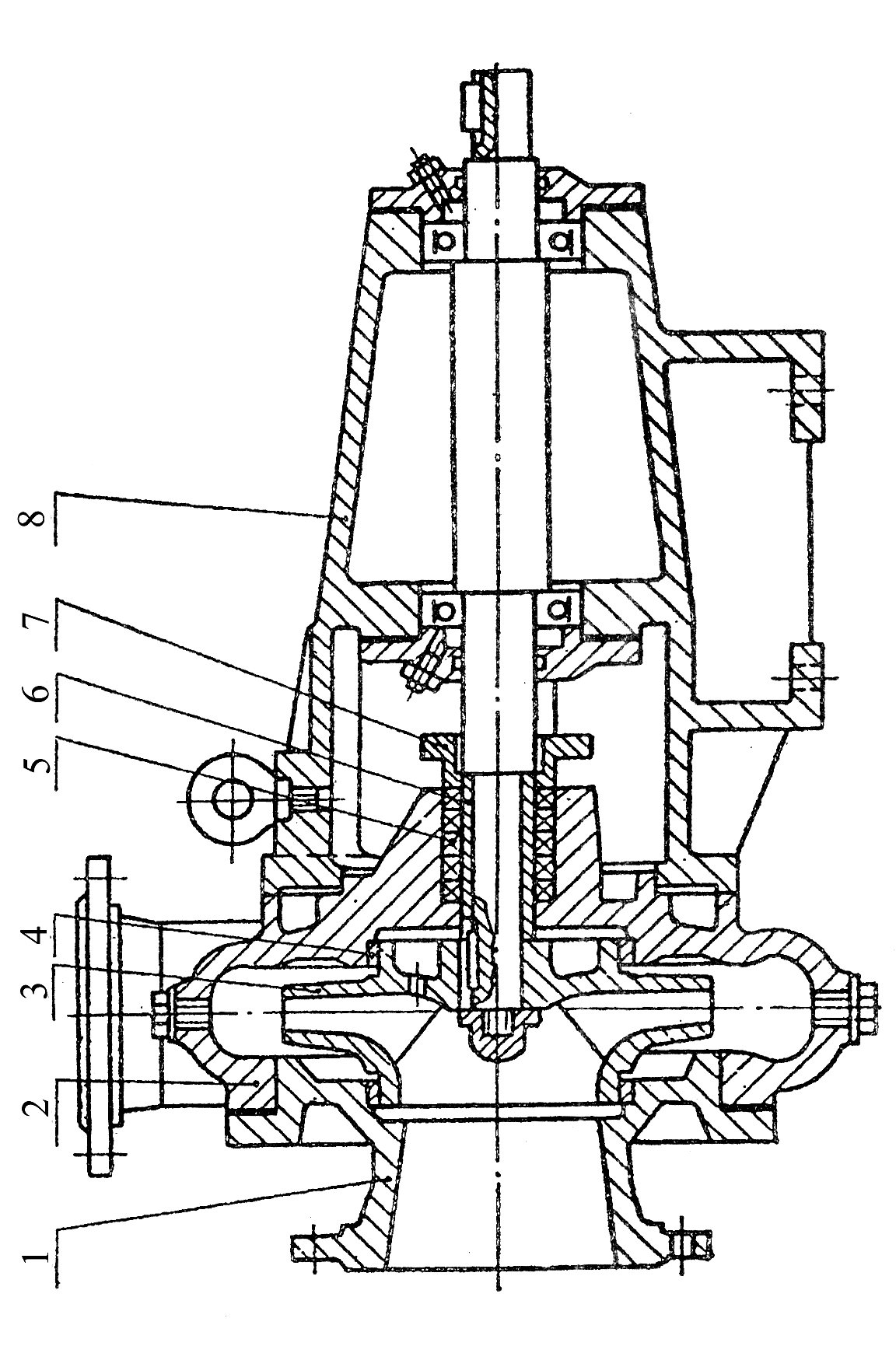 Рисунок 4.1 — Насос типа К: 1 — крышка с подводящим патрубком; 2 — корпус насоса; 3 — рабочее колесо; 4 — щелевые уплотнения; 5 — сальниковая х.б. набивка; 6 — защитная втулка;7 — крышка сальника; 8 — опорная стойка |