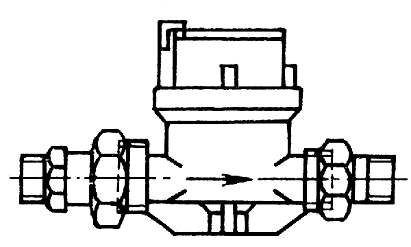 больших, чем крыльчатые. Рабочим органом является турбина, ось которой расположена вдоль оси трубопровода. Турбинные расходомеры присоединяются фланцами. Крыльчатые и турбинные расходомеры устанавливаются горизонтально, направление движения воды должно соответствовать стрелке на корпусе. Давление воды не должно превышать 1МПа.