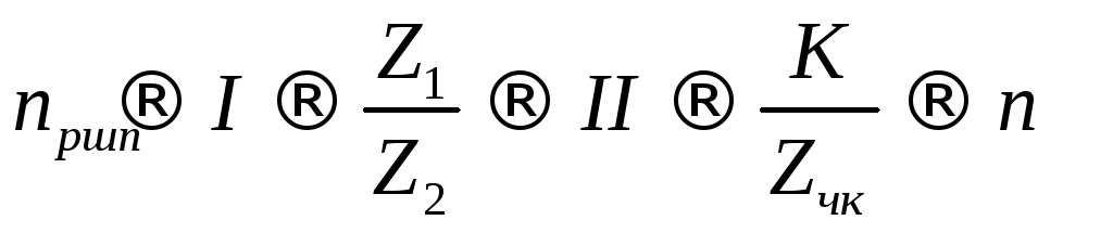 Исходя из этого, последовательность передачи движения в анализируемой цепи можно записать в виде следующей формулы кинематических связей: